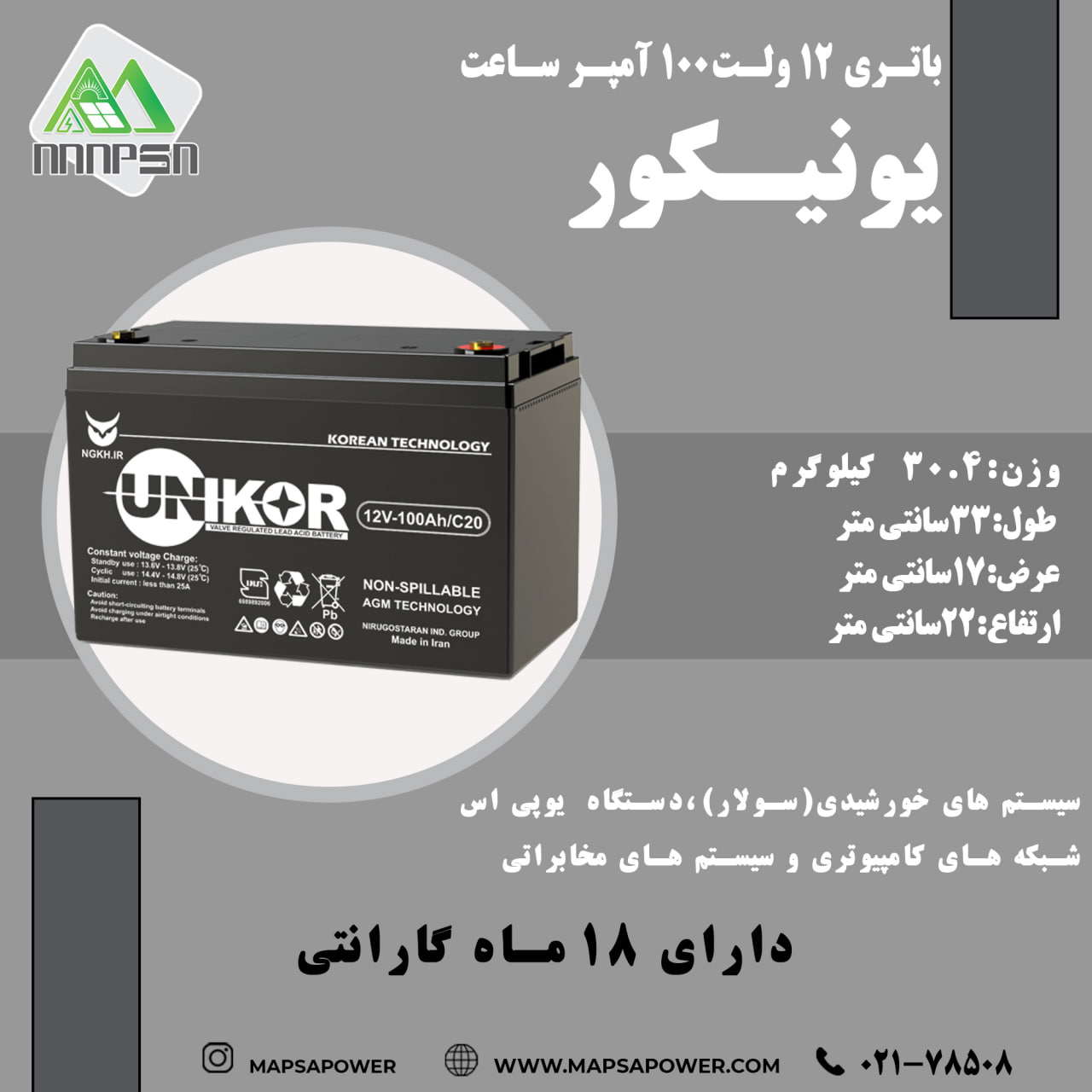 ولتاژ : 12 ولت / ظرفیت : 100 آمپر ساعت / طول : 33 سانتی متر / عرض : 17 سانتی متر / ارتفاع :22 سانتی متر / وزن : 30.4 کیلو گرم / دارای 18 ماه گارانتی
